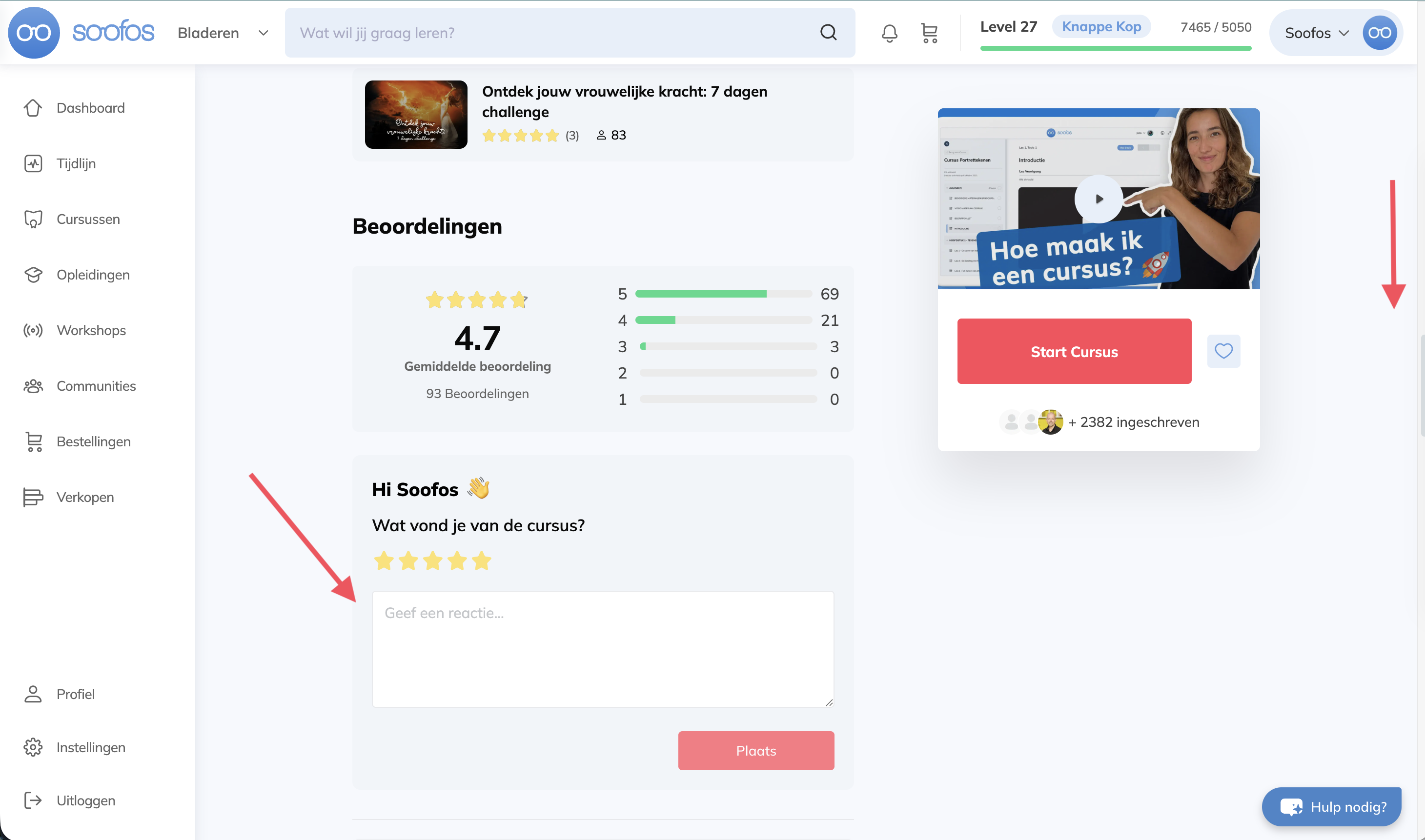 Op Soofos vinden we het super belangrijk om te weten wat jij van een cursus vond. Zo houden we de kwaliteit van onze cursussen hoog. Daarom vragen we je na het volgen van een cursus, of je een review wilt plaatsen. Hiermee help je medecursisten bij het maken van hun keuze, instructeurs bij het verzamelen van feedback en Soofos bij het checken van de kwaliteit van de cursussen. Dankjewel!