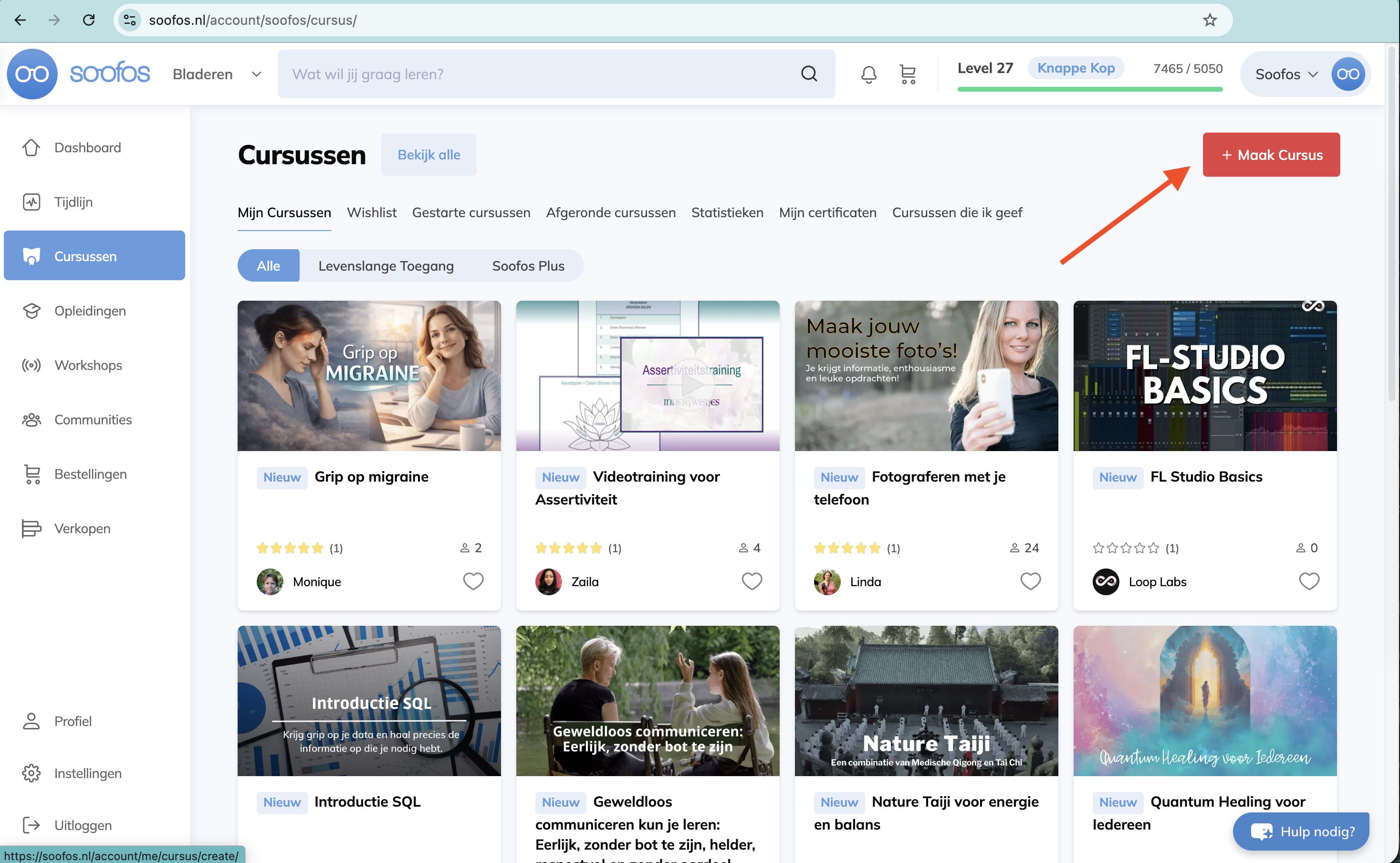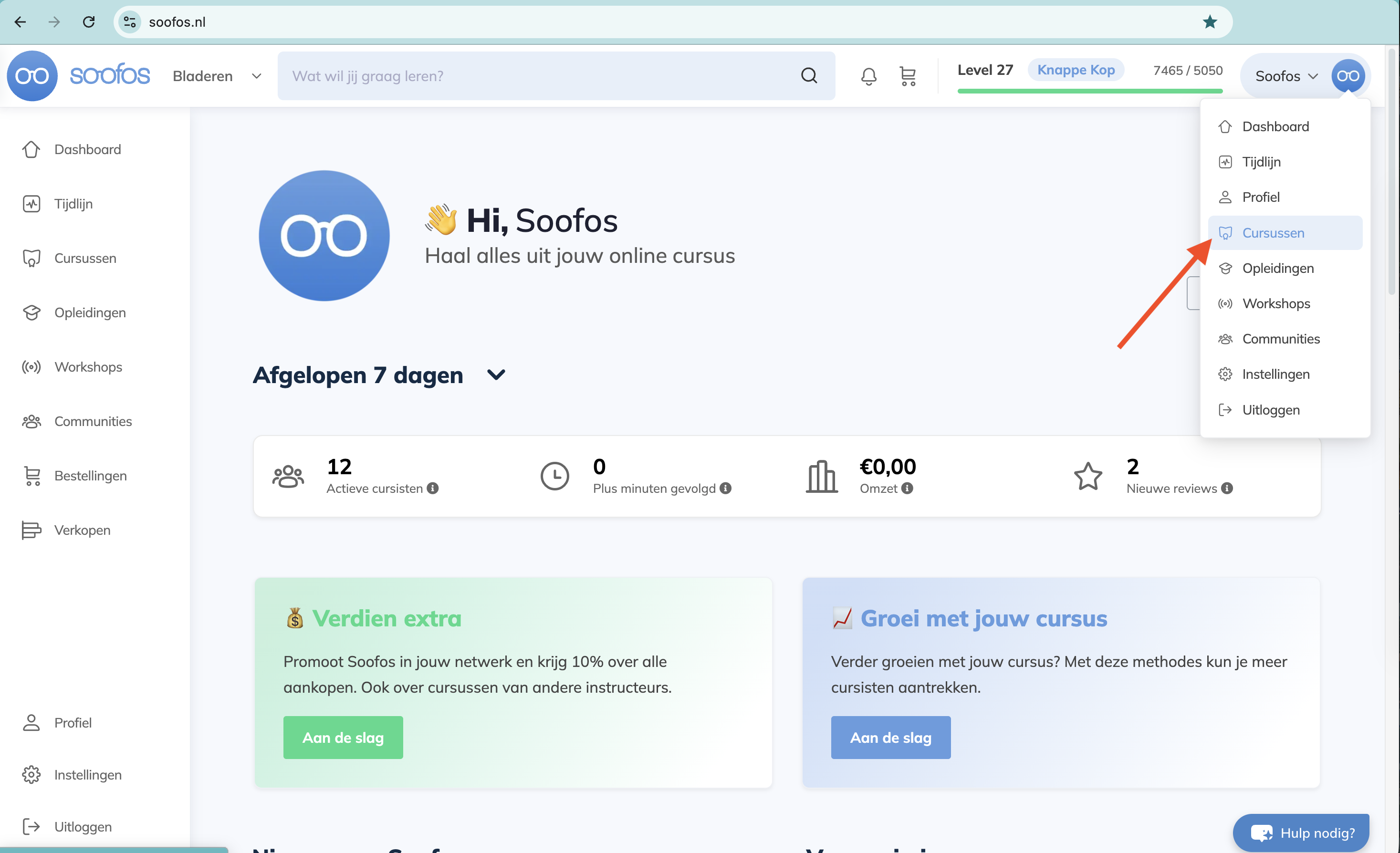 - Om een cursus aan te maken, zorg je dat je bent ingelogd op Soofos en dat je een instructeursaccount hebt (→ In dit artikel wordt uitgelegd hoe je een instructeursaccount aanmaakt).