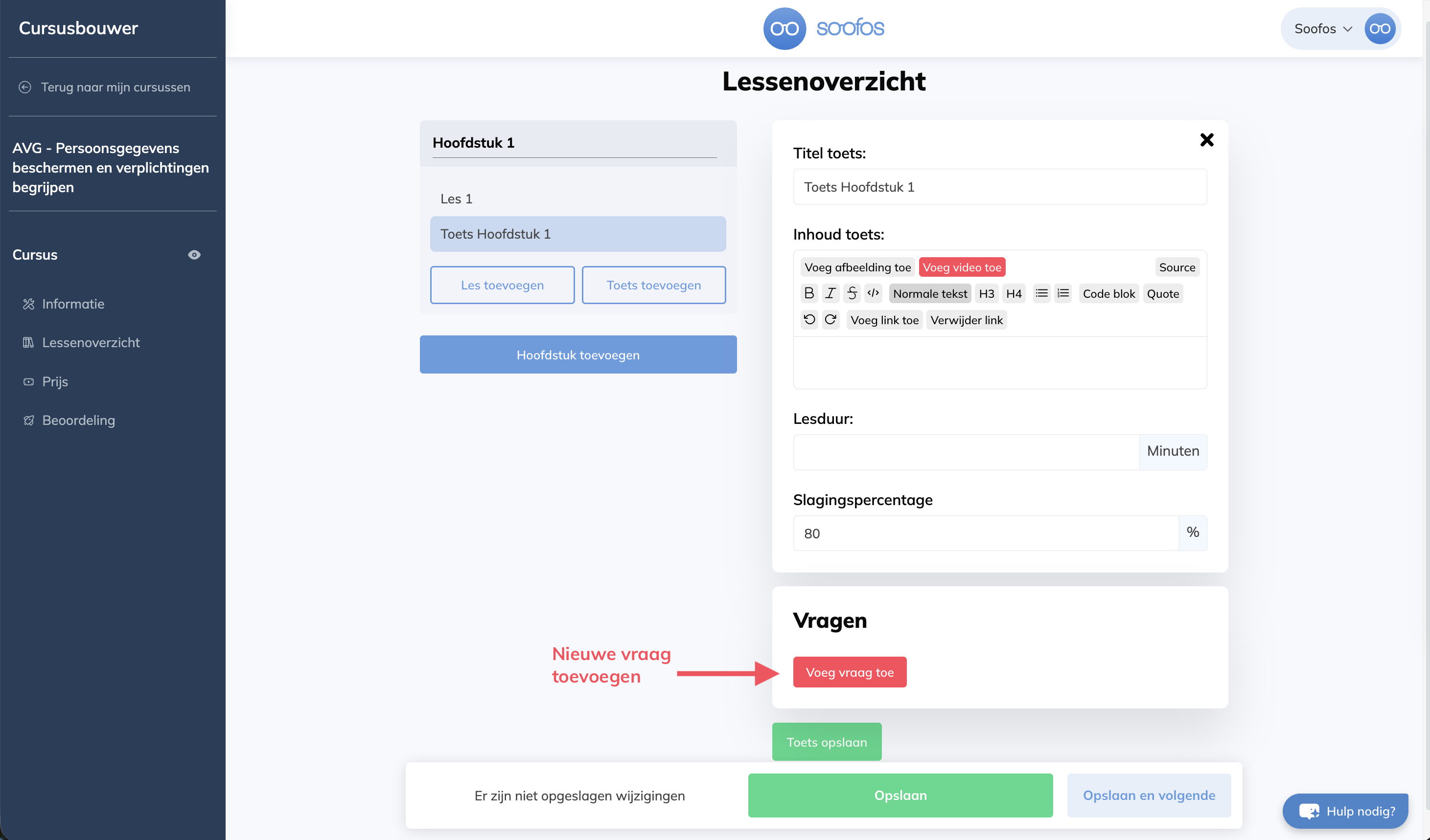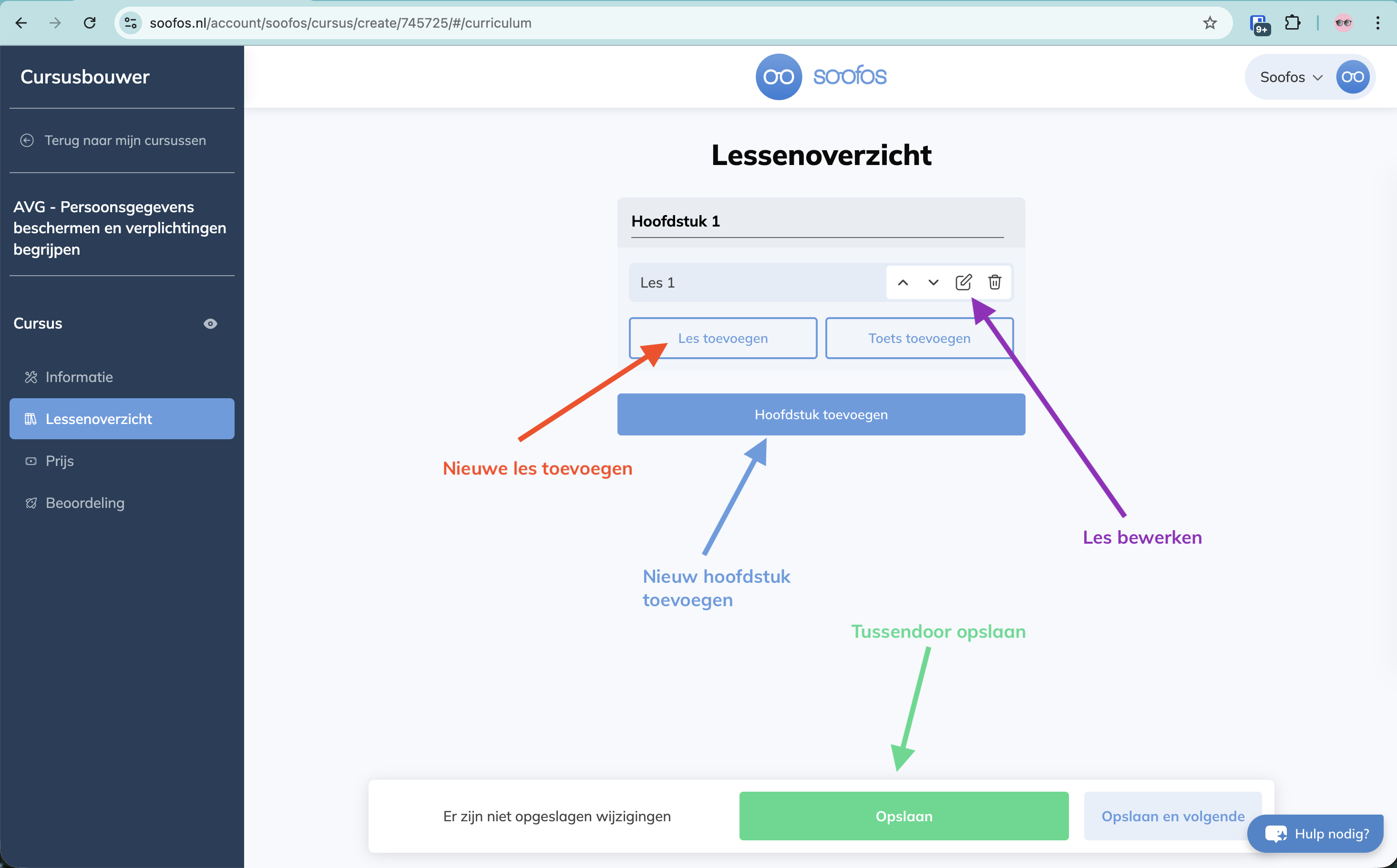 Zorg er altijd voor dat je je werk goed opslaat! Begin met het kleinste element: de les of toetsvraag. Nadat je deze hebt opgeslagen, kun je het bovenliggende element opslaan, de toets bijvoorbeeld. Tot slot klik op je 'opslaan en volgende' om de hele cursus op te slaan en naar het volgende onderdeel (de prijs) te gaan.