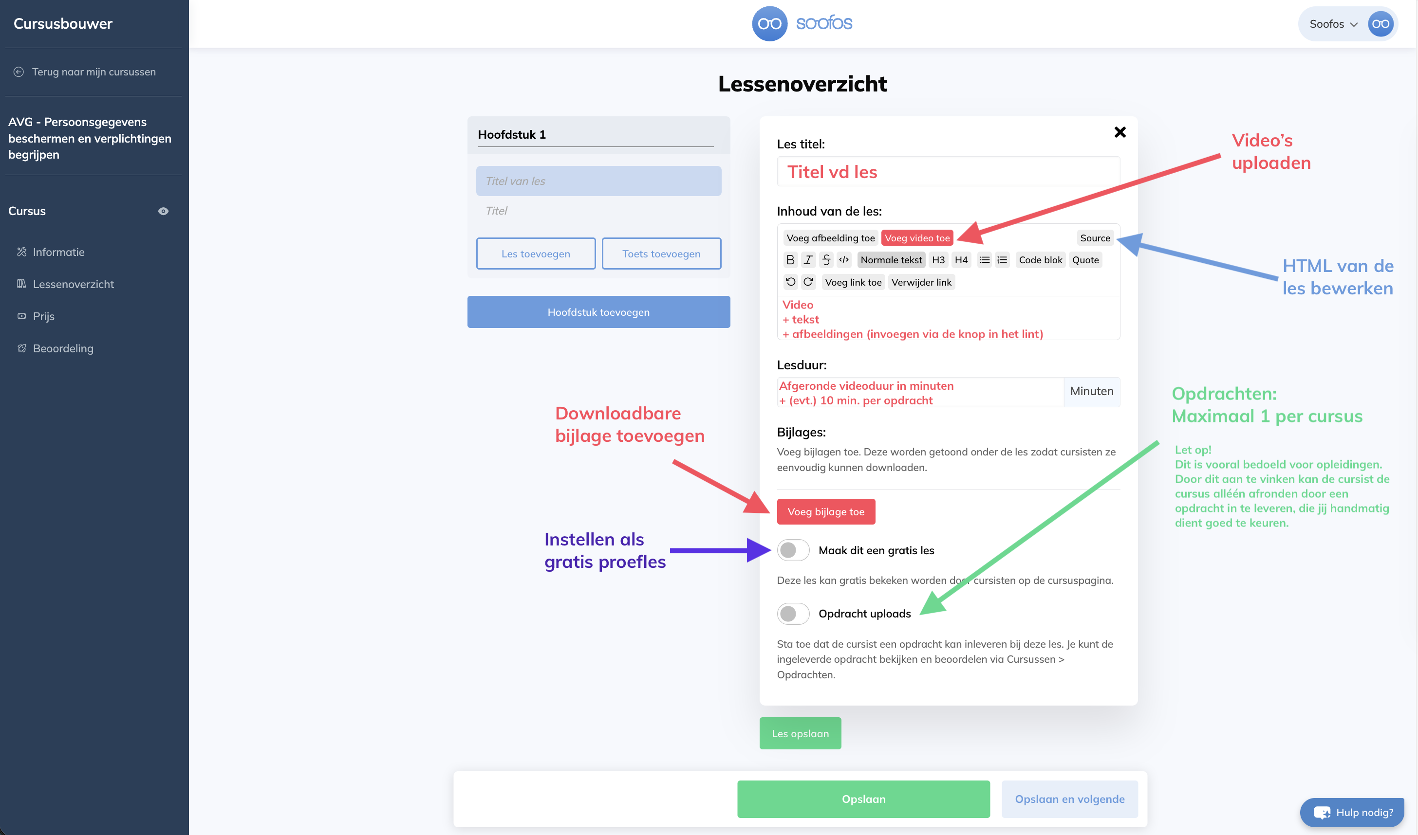 | Bijlages | Hier kun je bijlages toevoegen aan de les. Deze worden getoond onder de les, zodat cursisten ze eenvoudig kunnen downloaden. |